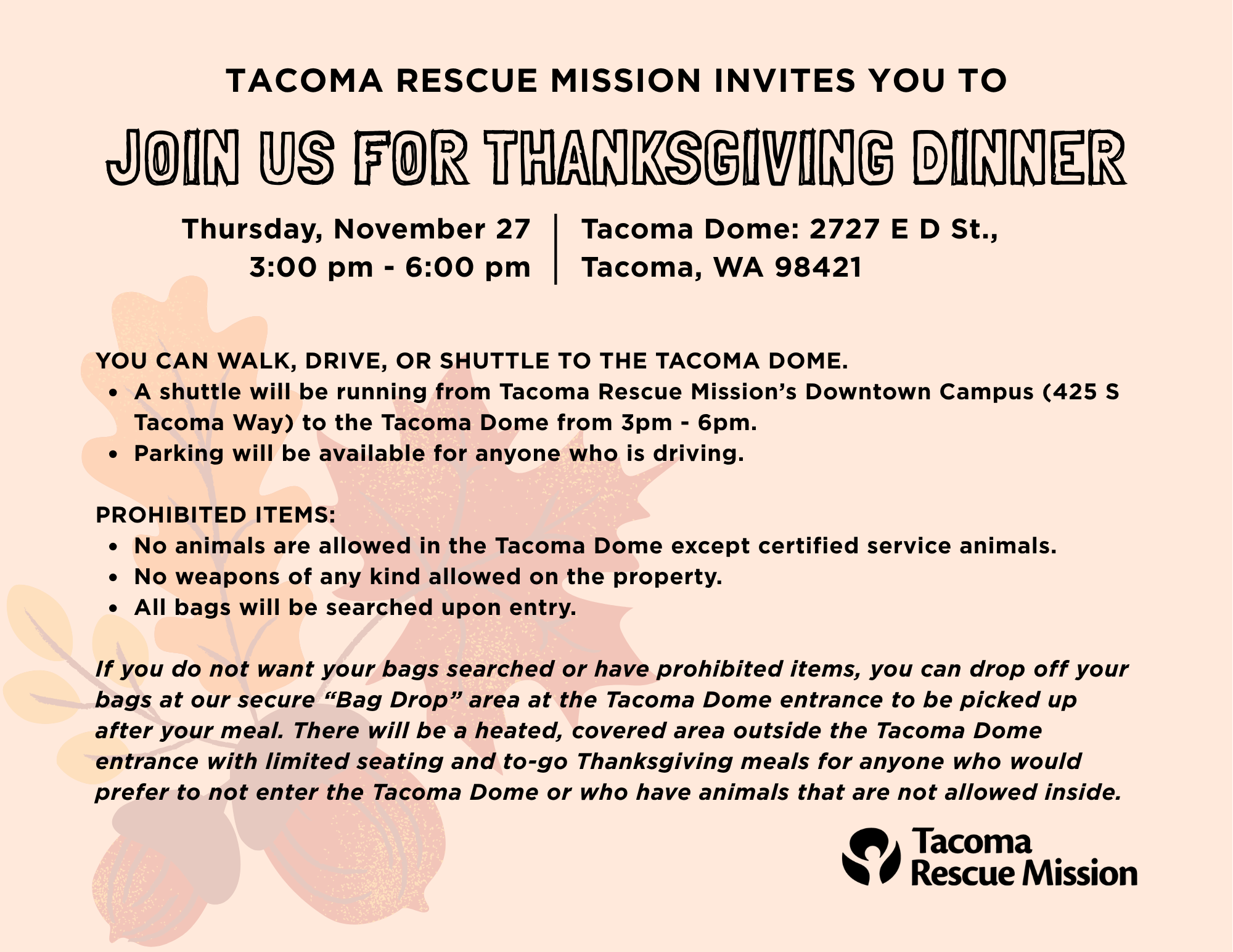 Our Thanksgiving Community Dinner will be on Thanksgiving day, 11/27/25, from 3:00 pm – 6:00 pm at the Tacoma Dome. Please help spread the word to our friends on the street, families and individuals facing food insecurity, and anyone who is left wondering where they will get their next meal this holiday.